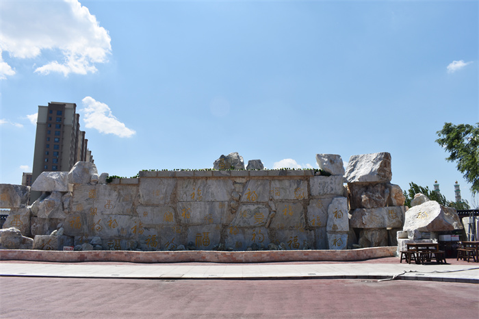 “福墻”:位于福街中央大街西廣場,群雕整體重300多噸,岫巖青玉上精心雕刻99個不同字體的“?!弊?,是中國最大的“?!弊謮?。“福墻”又稱“百福林”,寓意福澤綿長。